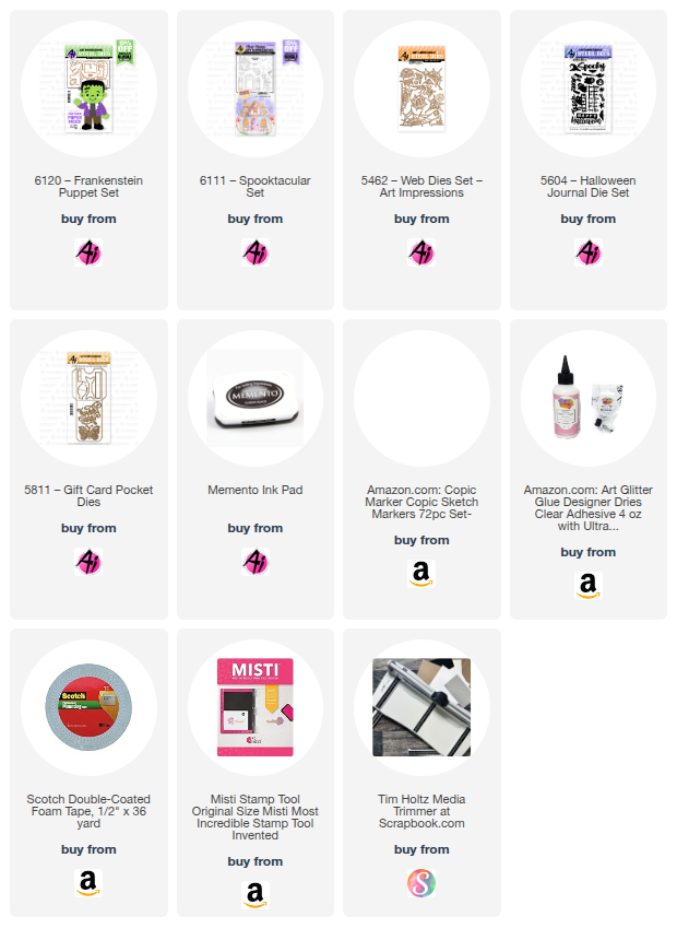 The card below is a pop up frame card. Push the sides in and the frame pop ups and away from Frankie. When the sides are pulled out, the card flattens to a 5 x 7 for mailing. Frankie's legs also wiggle side to side as well as his eyes. I used #6120 - Frankenstein Puppet, #5604 - Halloween Journal dies and the #5462 - Web dies set to create this card plus added a few sets of wiggle eyes (check out the little spidey on the left). LOL!